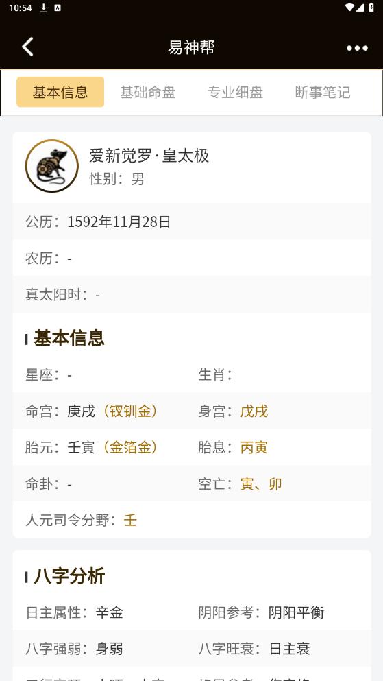 《易神帮APP》专业的八字排盘利器,专为命理探索者精心打造。其四柱八字排盘详尽入微,涵盖人元司令、命胎身至流月、流日、流时等全方位解析。十神、纳音、十二长生、神煞等术语一键查阅,轻松理解。更设古籍解析功能,让传统智慧触手可及。易神帮以精准、多功能的排盘体验,助力您洞悉命运,把握人生。