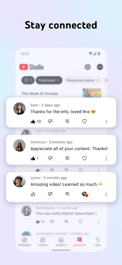 借助官方 YouTube 工作室应用,您可以通过随身携带的设备很好地了解社区成员并与他们建立联系。