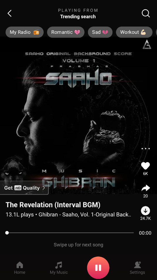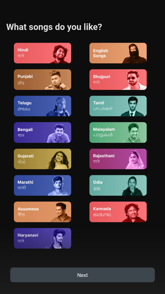 免费播放和收听印地语、英语、旁遮普语、泰米尔语、泰卢固语、博杰普尔语、孟加拉语、哈里扬维语、马拉雅拉姆语和其他地区语言的无限歌曲。