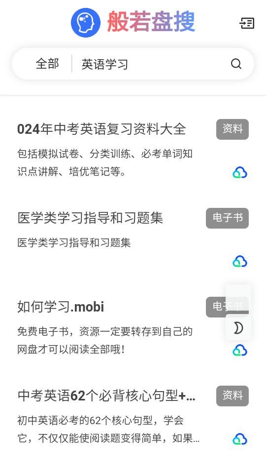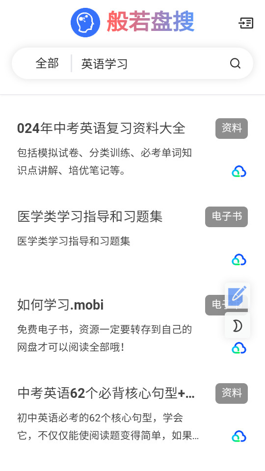1.下载安装并打开般若盘搜app,如果你有想要搜索的资源就直接在搜索框进行搜索,比如小编输入英语学习之后点击搜索