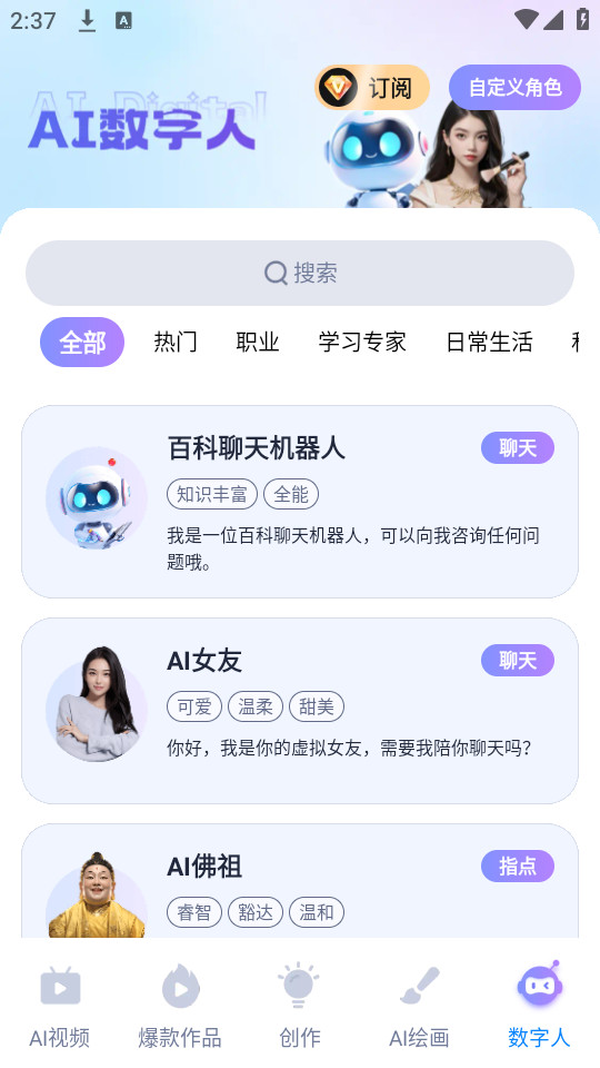 12.在【数字人】中可以根据你的喜好来选择各种角色进行聊天,直接点击【聊天】就可以了