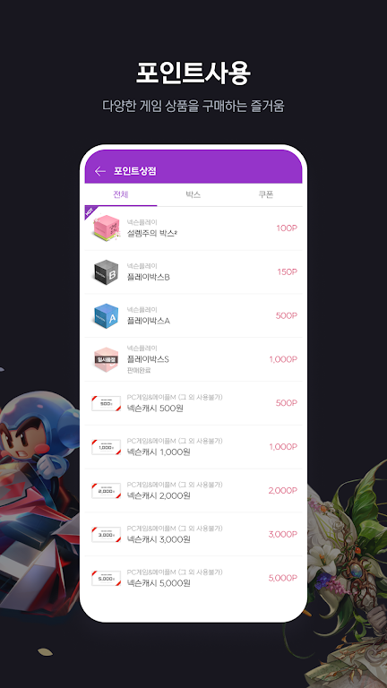 您可以使用累积的游戏积分购买 Nexon Cash,或者购买活动盒子和游戏物品,有机会赢得更多积分。
