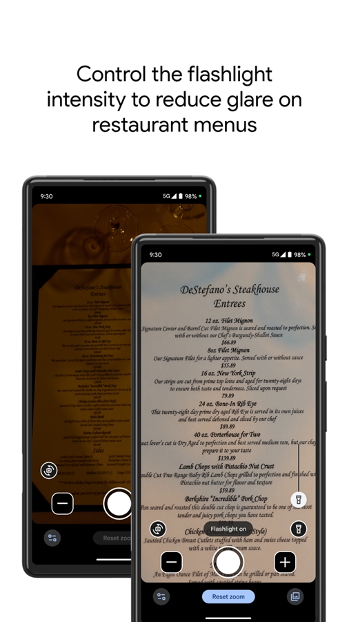 使用相机可放大小号文字,查看物体详细信息,或拉进查看远处的文字,例如路标或餐厅服务台后方的菜单。应用视觉效果功能可让低对比度文字更加清晰可辨。在光线较差的环境中,系统会自动调节亮度。您还能拍摄照片,并按需放大照片。
