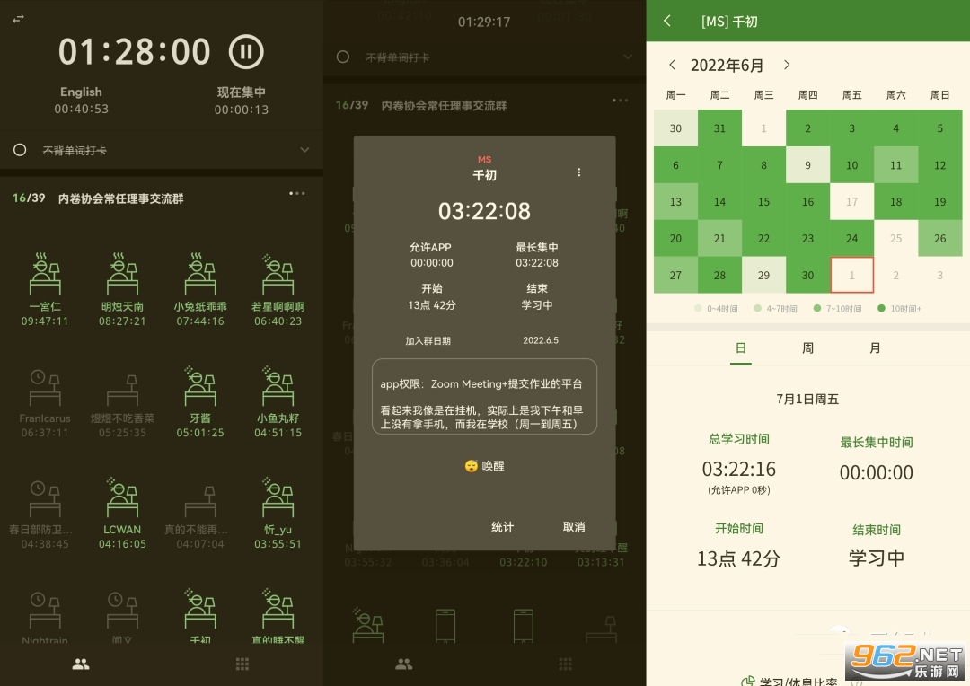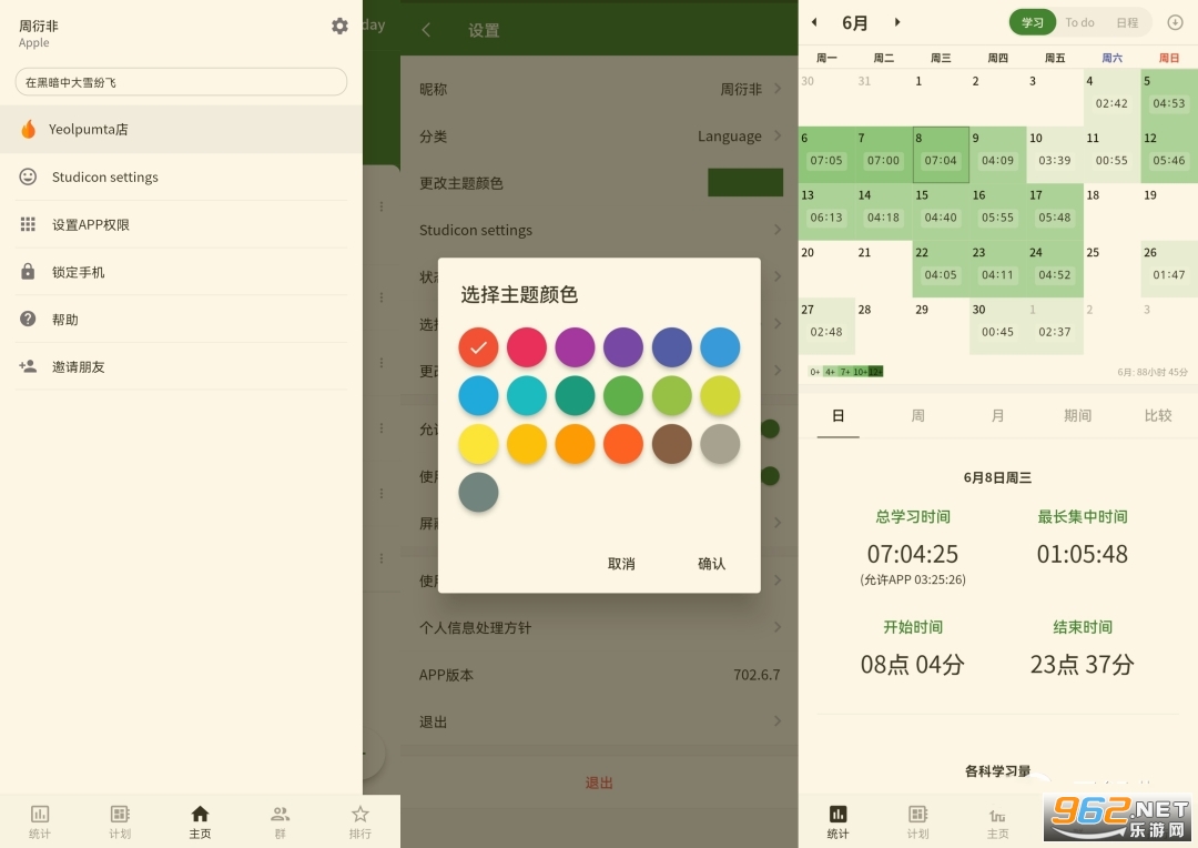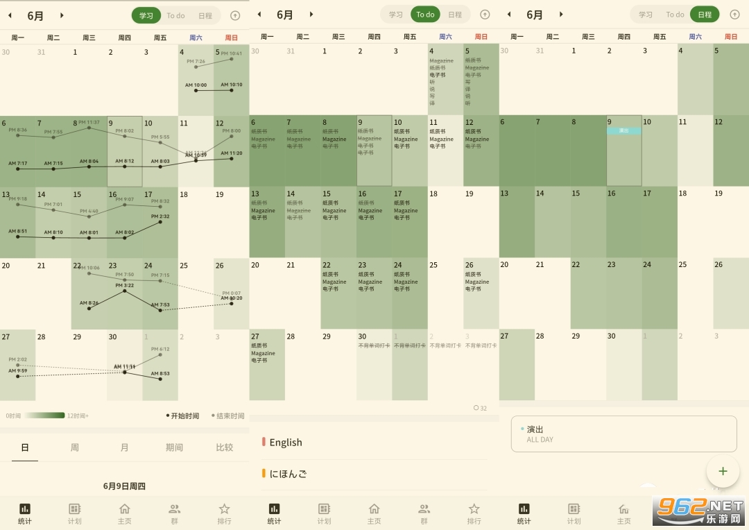 3.按日、周、月来确认学习时间,学习的时间越长,日历的颜色也会越深。
