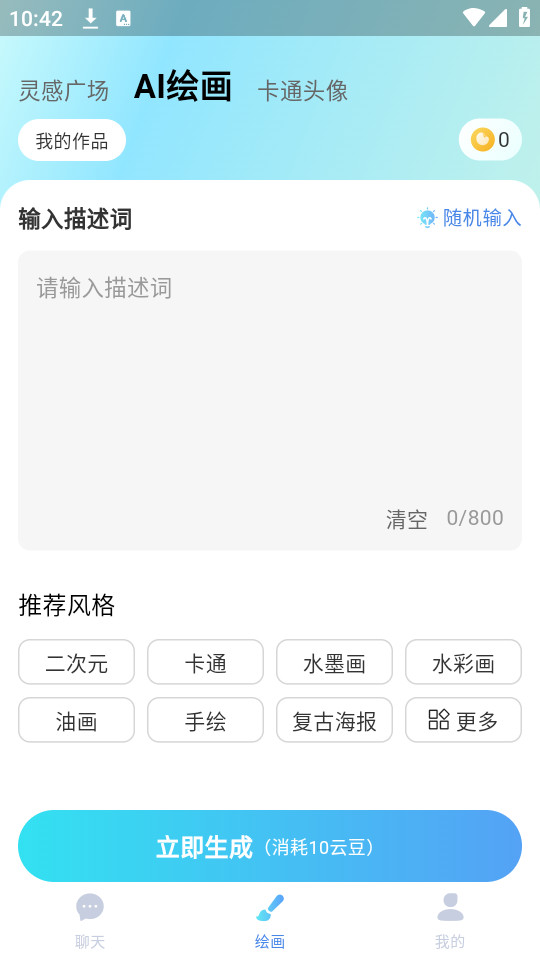 1、输入自己的创意,根据这些想法生成独特的绘画作品,满足个性化的创作需求;