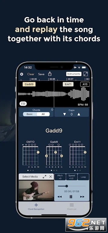 2、通过您的设备麦克风。您周围播放的任何歌曲,或您的设备通过流媒体服务播放的歌曲,都会通过您的设备麦克风进行分析,并实时显示歌曲的和弦。你可以回到过去,将歌曲与时间轴上显示的和弦一起重放