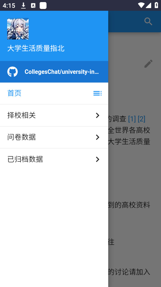 1.下载安装并打开大学生活质量指北app,点击左上角的三个横线