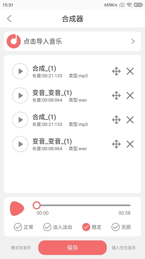 【音乐合成】 提供了多种合成模式,可将多首音乐按顺序拼接起来,特别是淡入淡出模式,可让您两首音乐的切换丝滑、流畅不突兀。