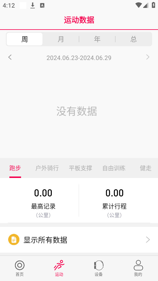 显示24小时运动数据,以及按周和月的总数据,以及相应的趋势统计图表。