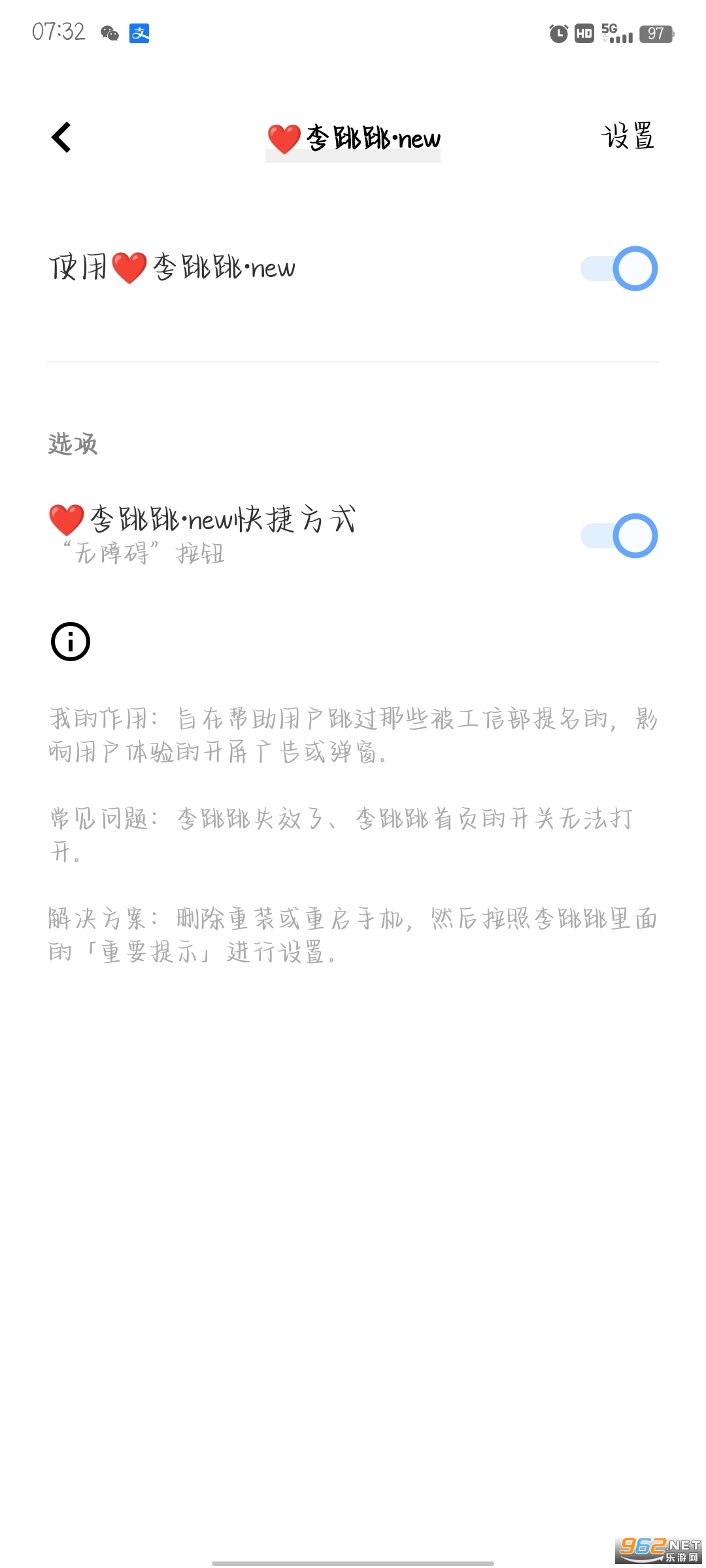 李跳跳是一款近期非常有名并且功能上面也是十分强大的一款广告跳过的软件,这款李跳跳APP能够直接的为用户跳过开屏广告的内容,支持多种手机和系统,并且整体的界面上面也是非常的极简,完全的免费进行使用软件当中也没有什么广告内容,快来试试吧。