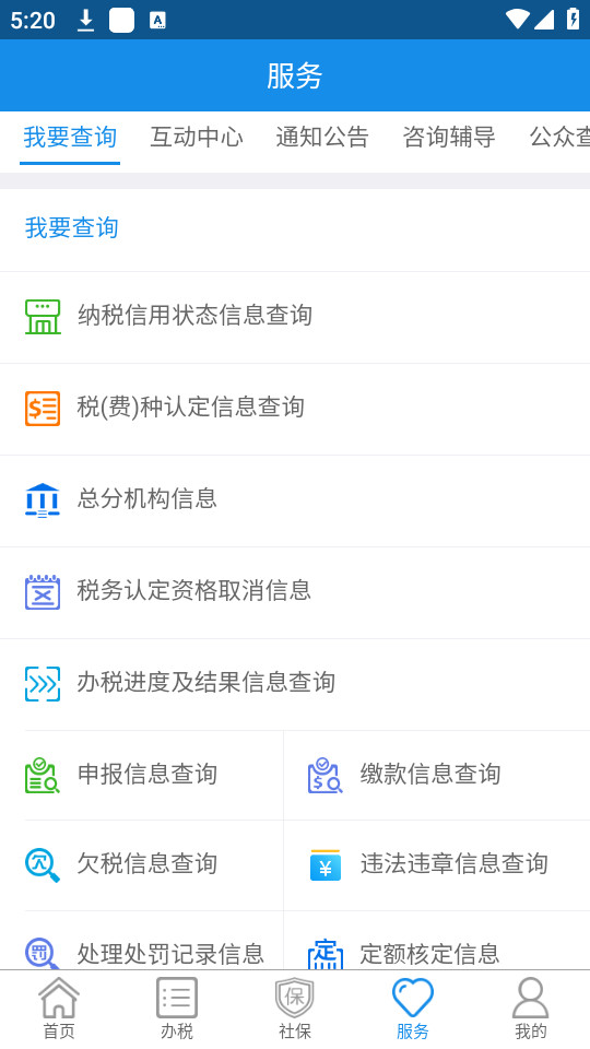 1、信息查询,登记信息、发票信息以及税款信息和办税速度在线查询;
