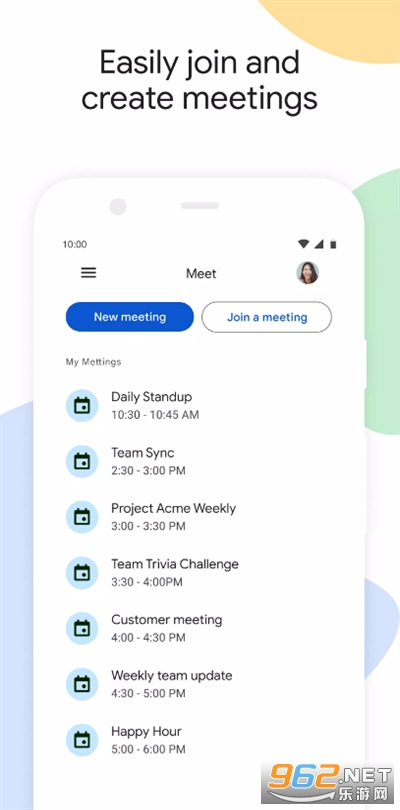 《google meet》是一款由Google LLC打造的以会议为核心的办公类软件,以视频会议的形式为核心,用户们能够自由的进行交流合作,共享屏幕等,容纳超多人,视频高清不卡顿,保护传输数据的安全隐私。快来下载吧!