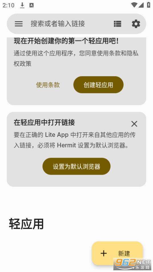 在hermit软件中创建轻应用只需要点击「添加」的 FAB,然后搜索你需要的站点或者直接输入地址添加,(应用内搜索是基于 Google 所以建议直接添加地址吧),底部可以编辑轻应用名,然后点击创建即可,也会有相应的桌面快捷方式在你的主屏上。