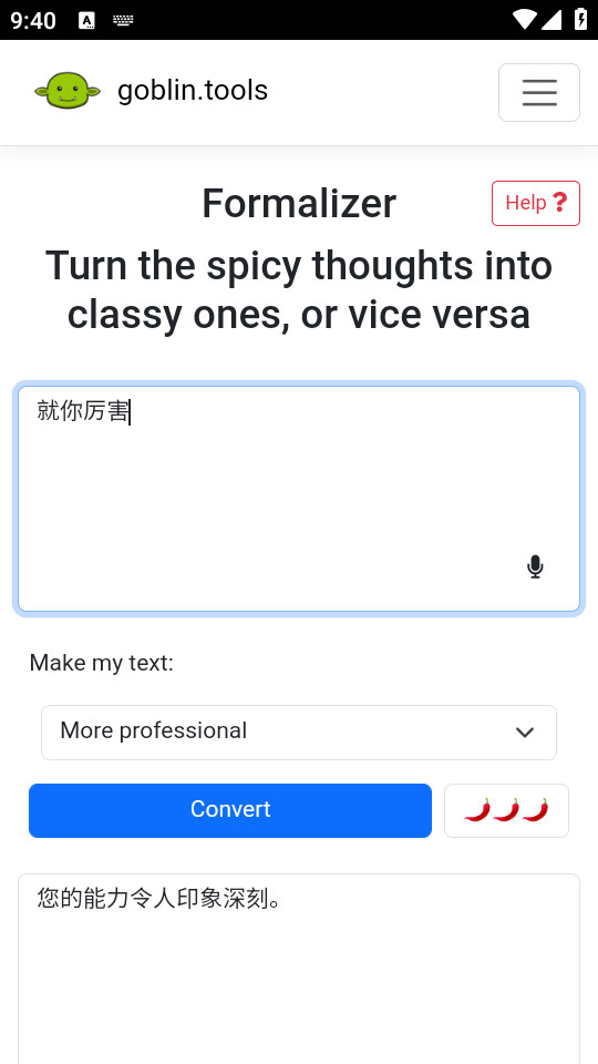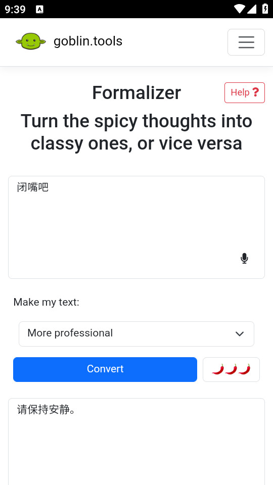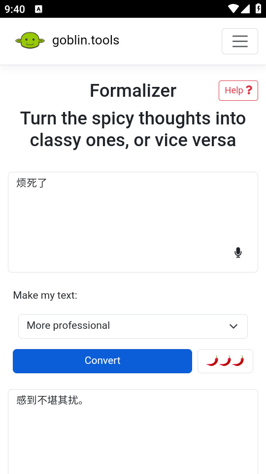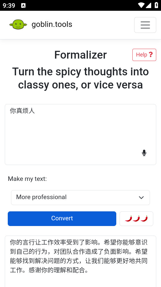 《goblin tools友好语气转换器app》也叫语气友好转化器以及阴阳怪气转换器,用户可以通过该APP找到各种语音转换的方式,将原本可能显得直接或冲动的语言转化为更加友好和温和的表达。提供多种转换类型,如更有礼貌、更专业等,用户可以根据实际需求选择适合的转换方式。转换过程简单快捷,用户只需输入原始句子,点击转换按钮,即可得到转换后的结果。系统会帮助用户学习各种高情商的回复技巧,使他们在与其他人互动聊天时更加得心应手。