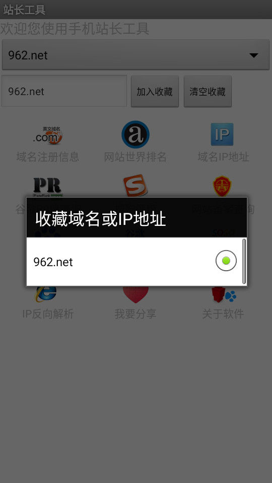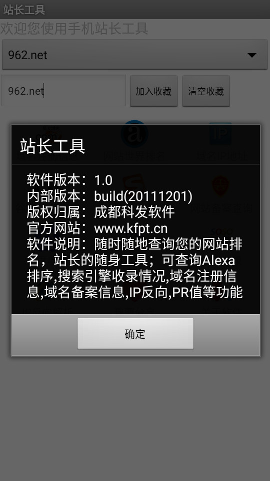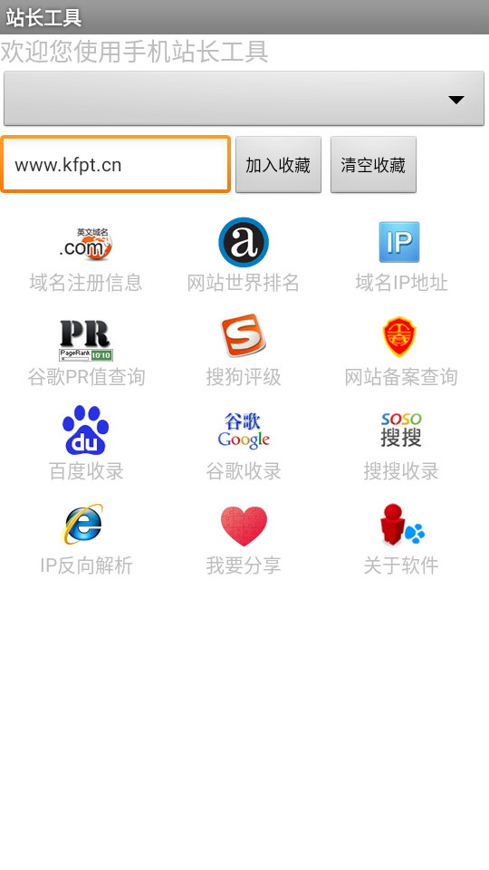 2.可查询Alexa世界排名、域名注册信息、域名IP物理地址、网站备案许可证信息、谷歌PR值、搜狗评级、百度收录、谷歌收录、搜搜收录、域名方向IP解析等使用功能;