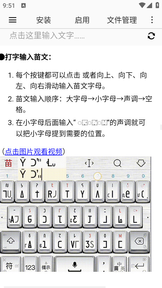 该输入法皮肤目前仅适用于安卓系统,且需要安卓9及以上版本才能支持苗文输入与显示。支持新/老苗文、大/小字母、声调的同界面输入。支持苗文与中文、英文的快速切换。配备翻译、识别、剪贴板、表情包等多种实用功能。