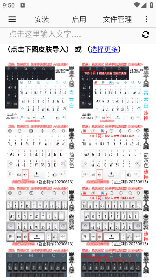苗文输入法皮肤安装APP一款可以将手机输入法应用更换成苗文皮肤的应用工具,软件中拥有非常多的苗文输入法皮肤可以选择,软件是需要搭配其他输入法应用进行使用的,超多皮肤等你下载。