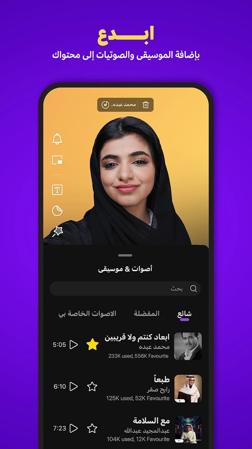 多样化的音乐和音频库,最著名的阿拉伯歌曲和大量音乐选择,以及其他用户的音频。