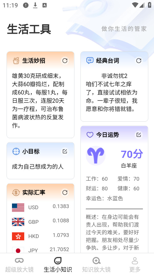 龙马放大镜是一款集超级放大镜、生活小知识和知识放大镜于一体的应用。