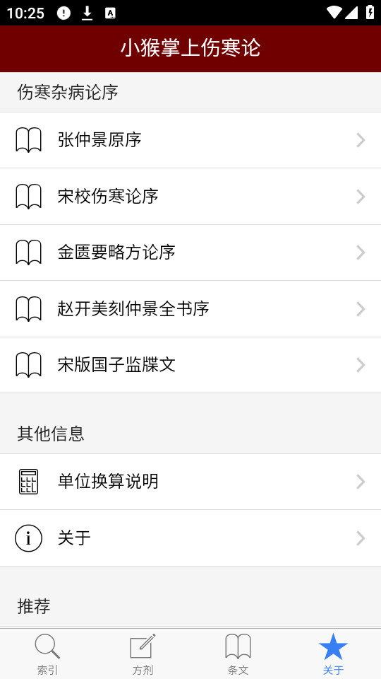 小猴掌上伤寒论应用是伤寒杂病论方剂与条文检索手册,主要以人民卫生出版社的宋本《伤寒论》与《金匮要略》为底本,并参考了《桂林古本伤寒杂病论》等相关书籍。共整理方剂总计275首,其中伤寒方113首(包括与金匮共用方43首)、金匮方145首、金匮附方17首。方剂信息中提供了现代剂量单位换算,仅供广大中医人士学习参考。