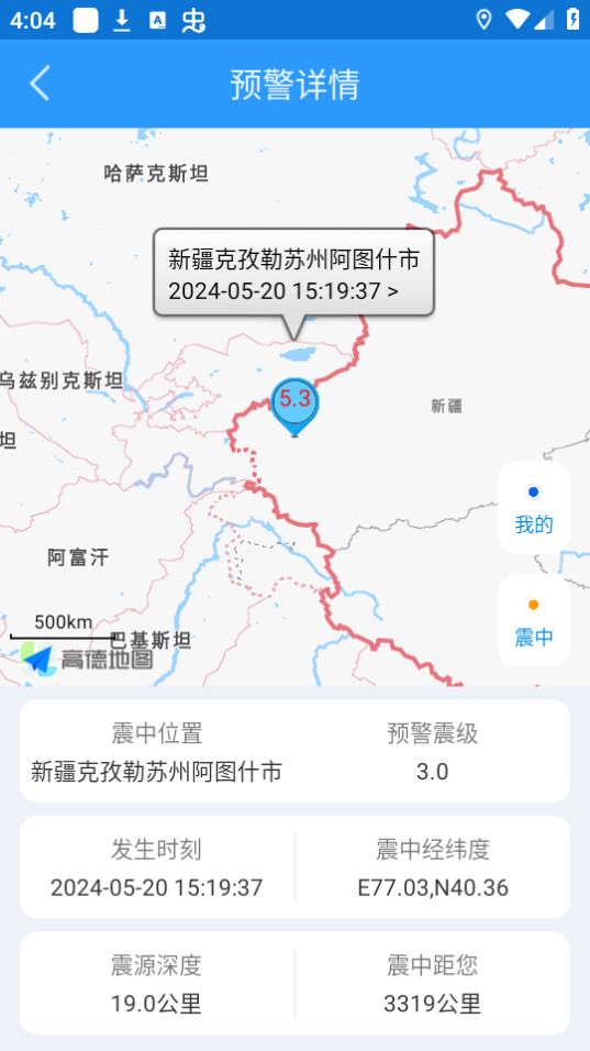 3.可以查看地震的详细情况,以及自己的位置和震中的距离