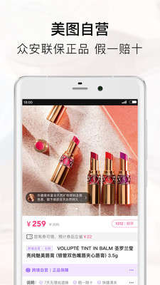 1.精品美妆,正品保障:美图美妆联合众安保险为你严选把关,美图自营,保证100%正品,假一赔十,让用户买的放心、用的放心!