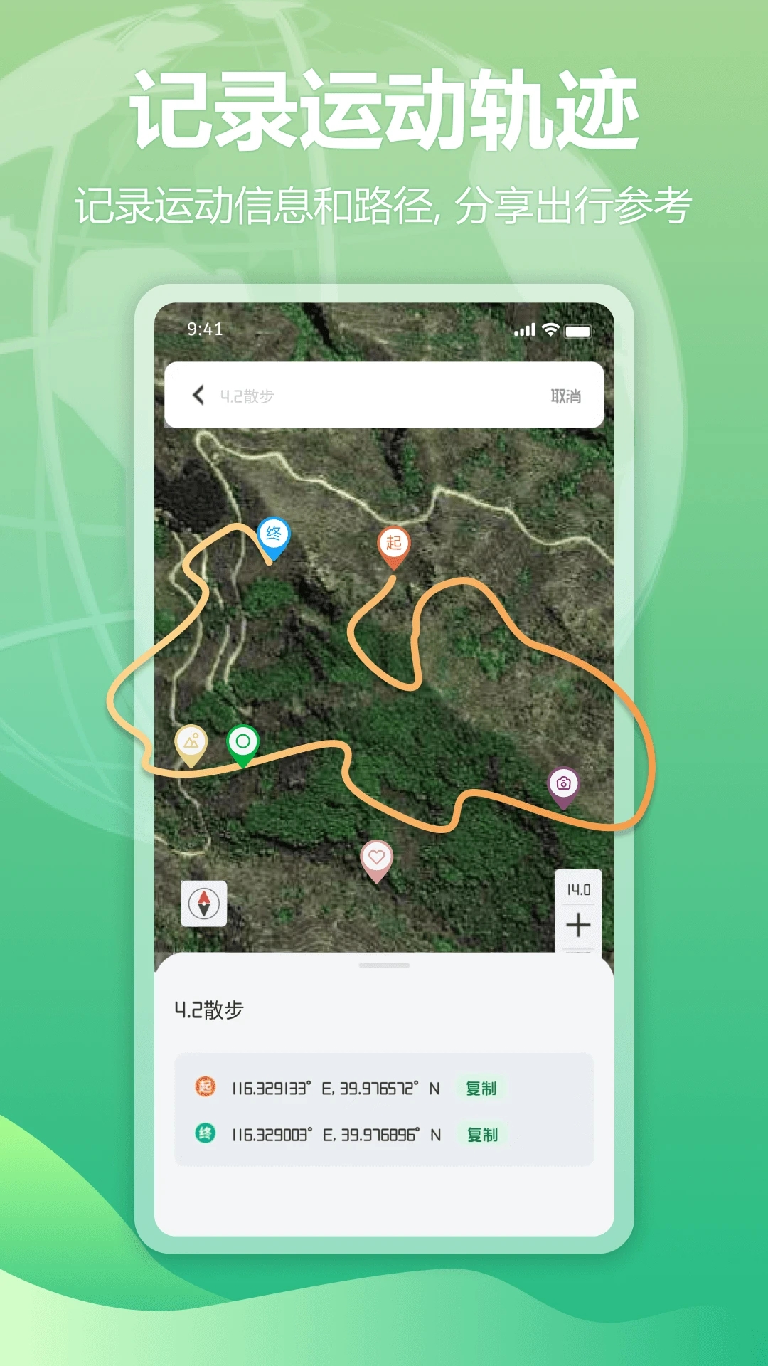 您可以在四维地球探索版中记录运动轨迹,保存路线信息,为日后出行及更多户外爱好者提供参考。