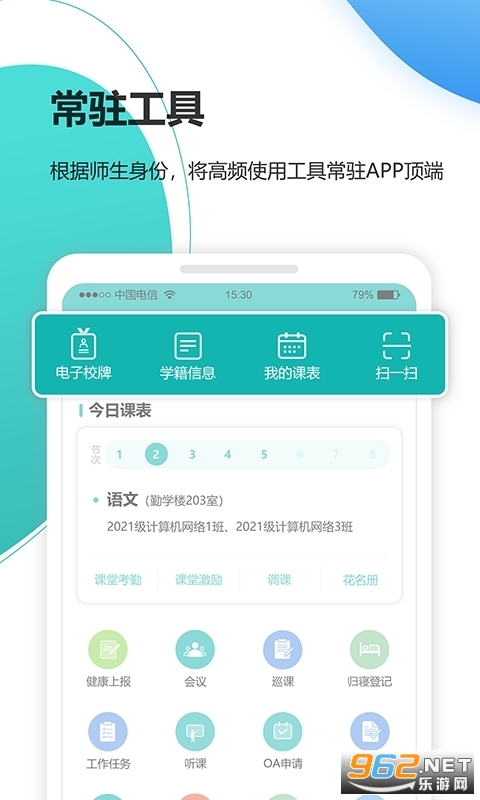 包括校园通讯录、校园圈、即时消息、校园公告、办公邮箱、日程提醒、电话会议、办公短信、语音通知等,满足日常办公管理需求