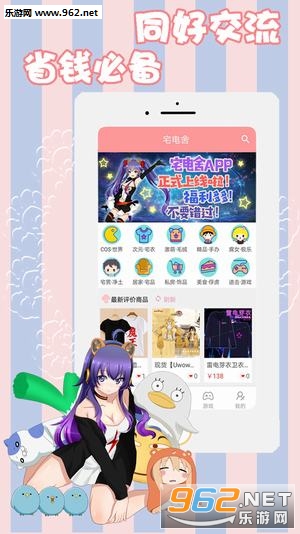 宅电舍app是专为喜爱二次元的小伙伴特别打造的各种动漫二次元周边商城,通过宅电舍app可以看到各种周边的商品、各种手办同人生活小商品,欢迎加入宅电舍app购物、晒宝、讨论、COS吧。