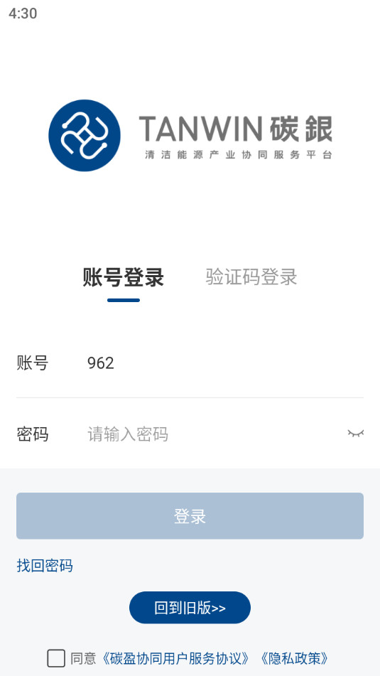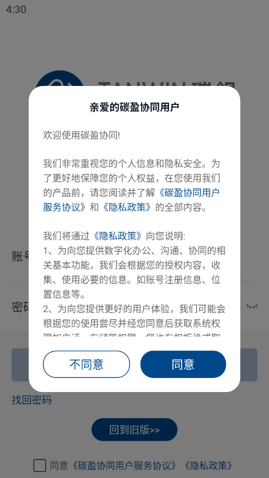 下载并打开碳盈协同app,点击【回到旧版】就可以回到旧版本进行登录了