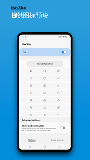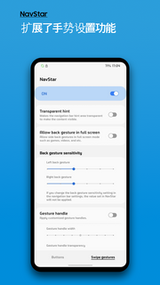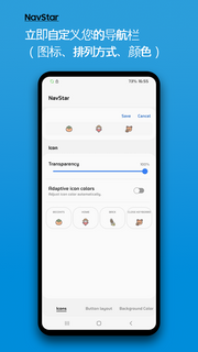 三星navstar导航栏是一款通知栏管理软件,您可以更换导航栏上三个菱形按键的图像,可以设置导航栏透明、全屏使用返回手势、调整返回手势的灵敏度等,还可以给导航栏添加按钮,支持手机导航栏修改、导航栏组件优化等功能,功能强大,界面清爽,该软件可以帮助我们自定义导航栏图标,支持调整颜色、布局、透明度 、添加自己喜欢的图片等,比如把Home键换成苹果图标就会很有趣,有需要的用户赶紧下载来试试吧。