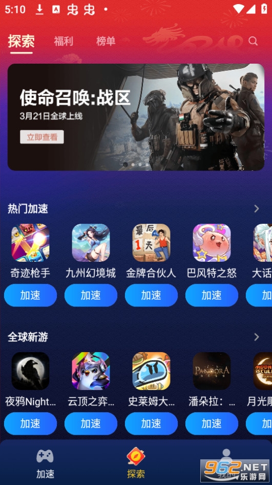 3.如果没有提前下载,就点击探索,在右边的搜索框找到自己想加速的游戏
