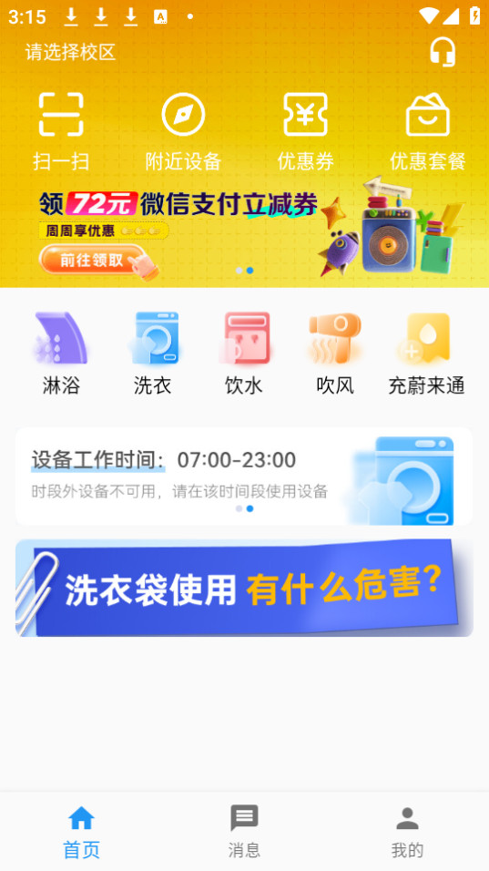 《蔚来校园app》是一款为大学生提供校园生活服务的应用程序。它集成了学生们在校园中常用的各种功能和服务,方便他们在校园生活中的各种需求。体验方便的校园淋浴、洗衣、饮水以及吹风等各种服务,直接在线充值缴费。通过APP打通与支付宝、支付功能的连接,实现智能设备的线上支付与远程操控。主要提供校园洗衣机、吹风机的线上支付与远程监控服务,为校园生活带来了极大的便利。有需求的话就快来下载吧!