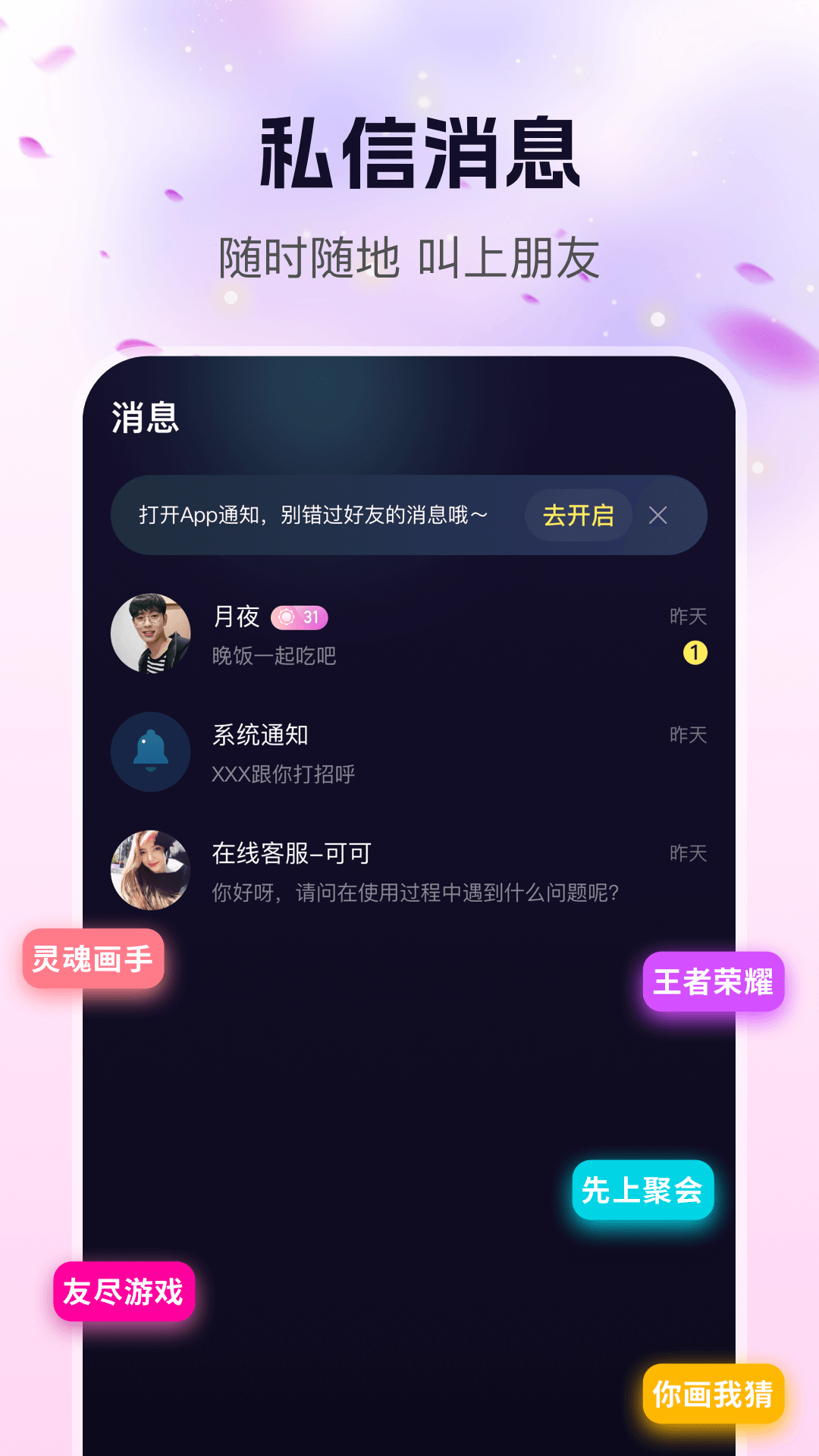 一款充满活力和趣味性的游戏社交软件,它以其独特的游戏社交模式和丰富的功能吸引了众多年轻人的关注。除了游戏社交和语音互动外,玩遇交友app还提供了音乐点唱、趣味对话等多种功能。用户可以在这里展示自己的才艺,与其他用户进行互动,增加交友的乐趣。重视用户隐私和安全,采取了多种措施保障用户信息安全。用户可以放心使用这款app进行社交活动,享受安全、愉快的交友体验。