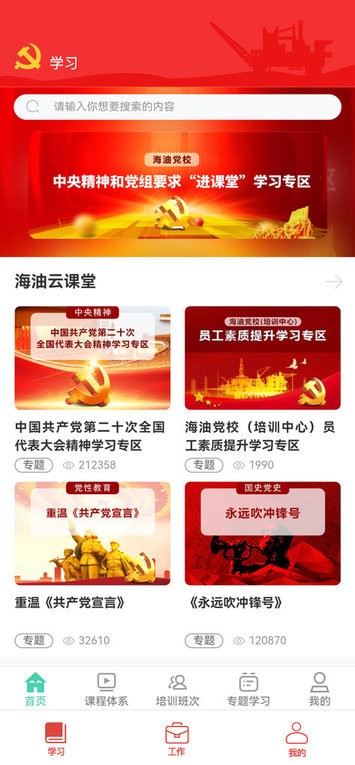 海油党建手机端是中海油集团公司的党员学习培训平台,这是移动党建信息化软件,为党群工作的开展提供学习 保障。除了丰富的党群信息,还有集团的通知和服务内容,可以在线学习和答题