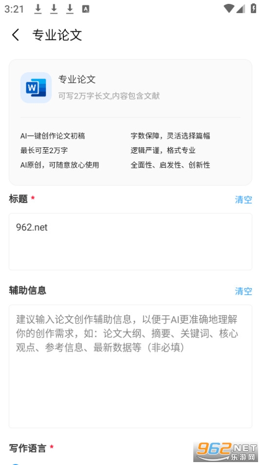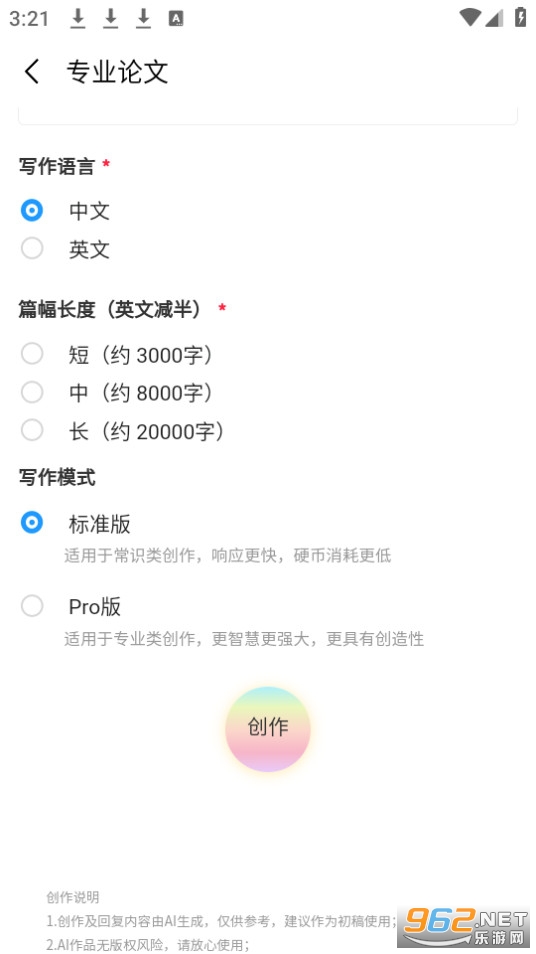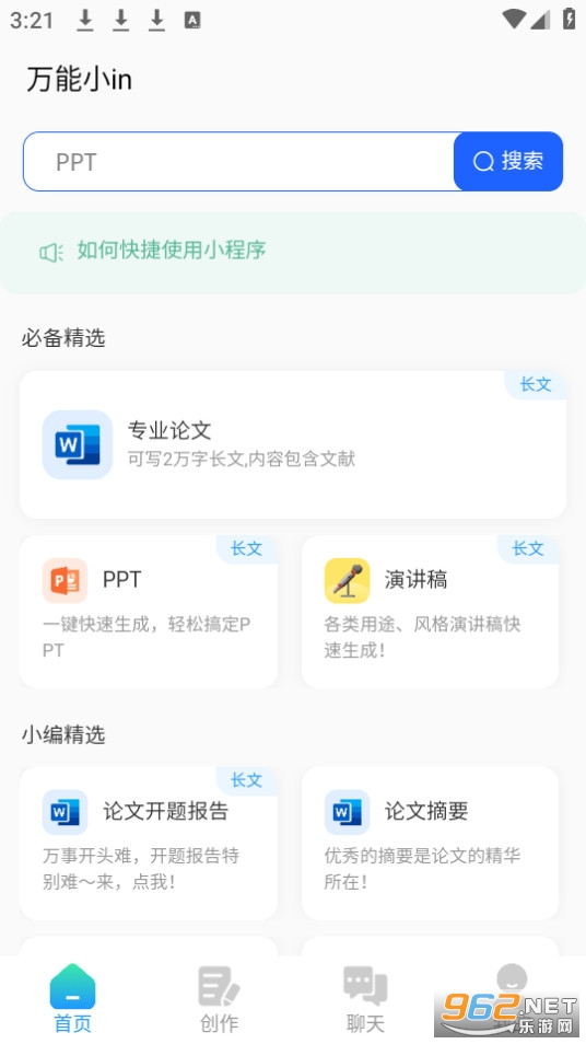 可以一键生成论文,包含“论文大纲”、“开题报告”、“论文摘要”、“专业论文”,最长可达两万字,还可以做PPT等。