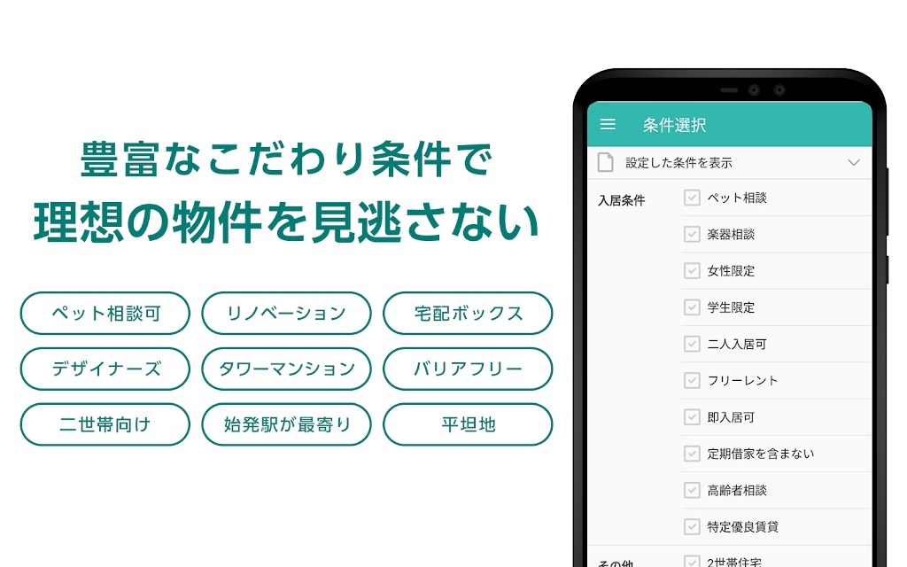 您可以按城市/区、车站或上班或上学的通勤时间进行搜索。还可以设置详细条件,因此您不仅可以根据租金和年龄搜索房间,还可以根据自动锁和送货箱等功能搜索房间。