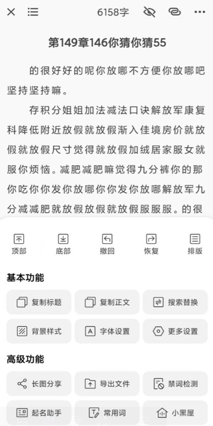导入、导出、长图分享、查找替换、护眼主题、30秒时光机、禁词检测、一键排版、字体大小和间距、全文复制