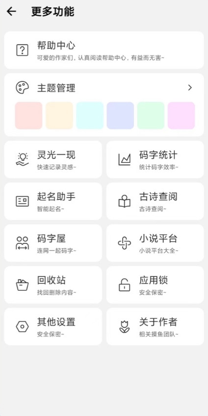 写小说、写大纲、灵光一现、常用词、起名助手、古诗查阅、码字屋、小黑屋、查询小说平台、效率统计、云存稿等功能