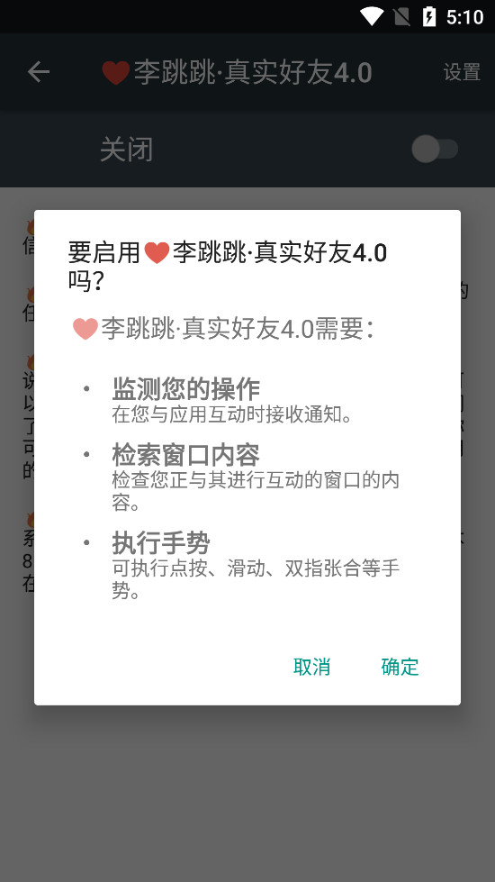 点击无障碍权限后面的按钮,在跳出的页面选择李跳跳真实好友4.0,然后再次点击开启按钮,点击确定;