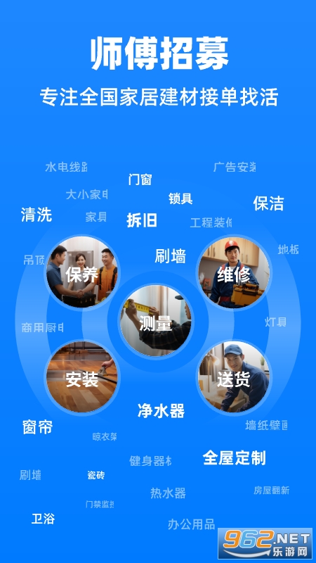 平台聚合了家具、家电、卫浴、晾衣架、灯具、智能锁、门窗、健身器材、充电桩、广告海报、智能设备等数百万家居商家&千万家庭用户的服务需求,师傅随时随地即可实现服务交易