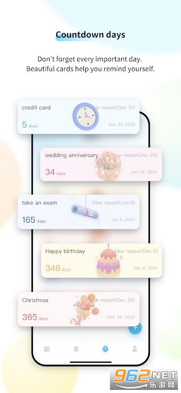 5.倒计时,提供5种卡片(生日、考试、周年纪念、节日、默认)并可设置为小部件 6.