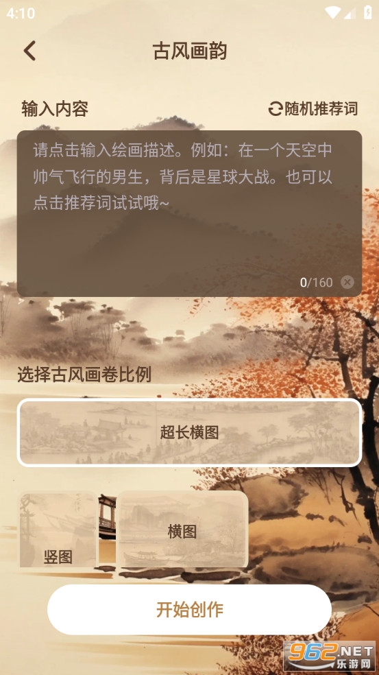 超好用的一款ai画画类的手机软件,能够直接通过文字生成各种你喜欢的图片表情等,甚至还能够生成古风式的画卷,自己选择好排版就可以了,用起来很方便。快来下载吧!
