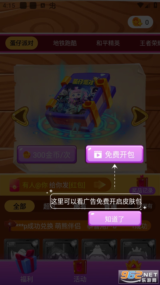 2.打开全皮大佬app,点击【免费开包】,看视频就能够免费开游戏碎片包
