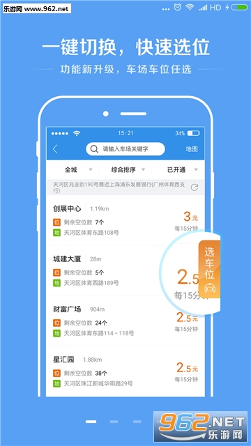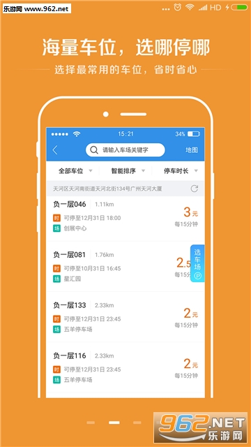 2、打开应用自动推荐附近车场及车位,3秒内完成订位;
