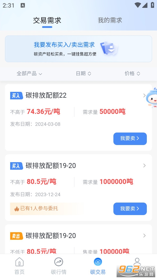 发布碳配额交易买卖需求,即时查看需求大厅,便捷对接交易。