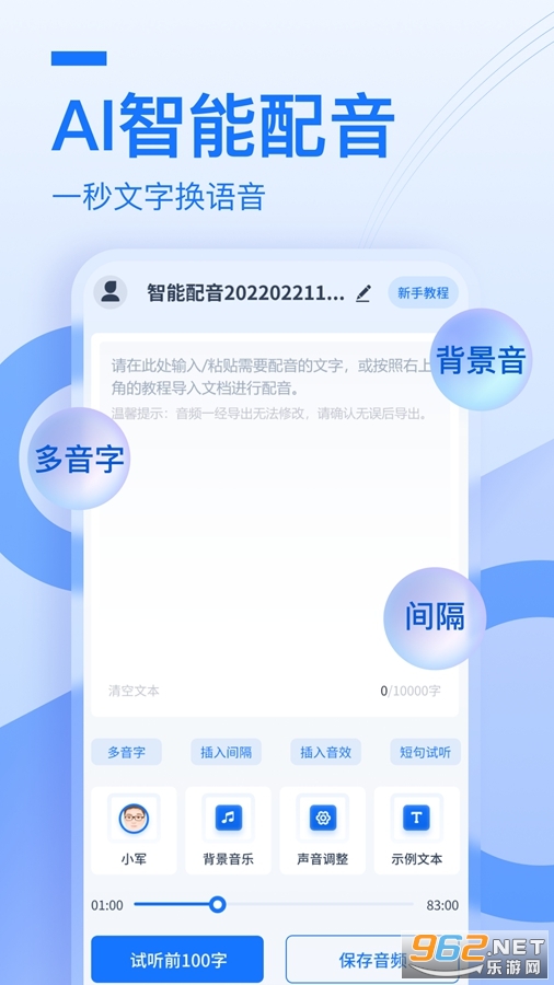 采用AI技术,可设置多音字、间隔、音效等参数,高度拟人化。