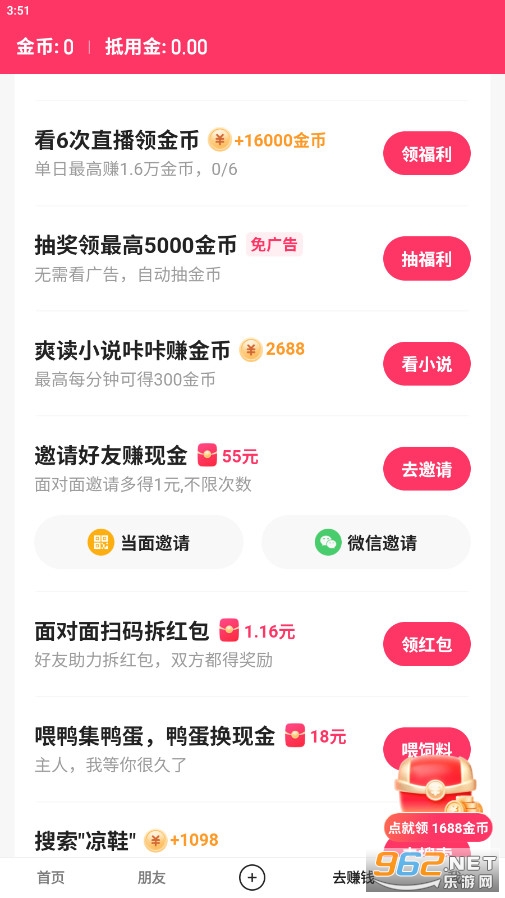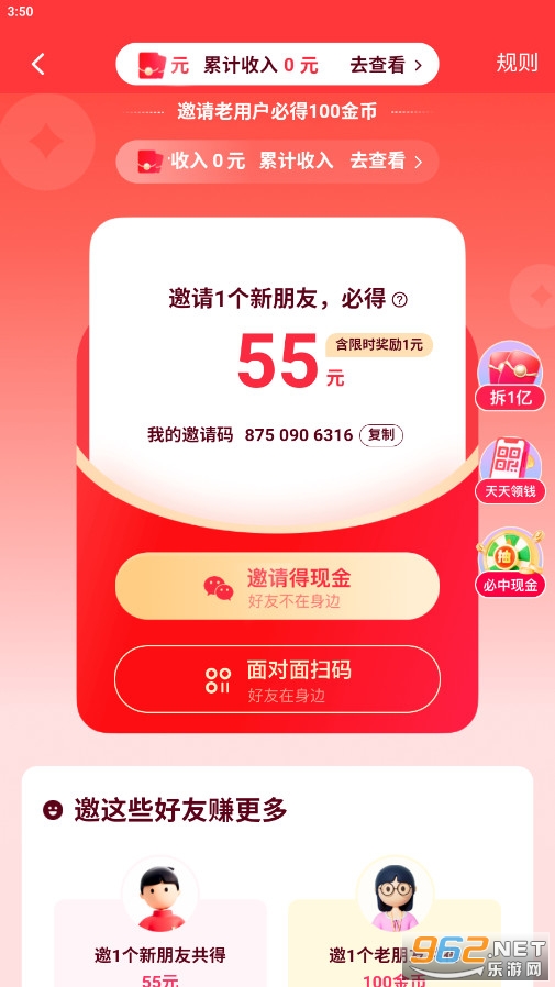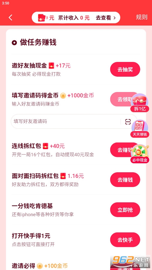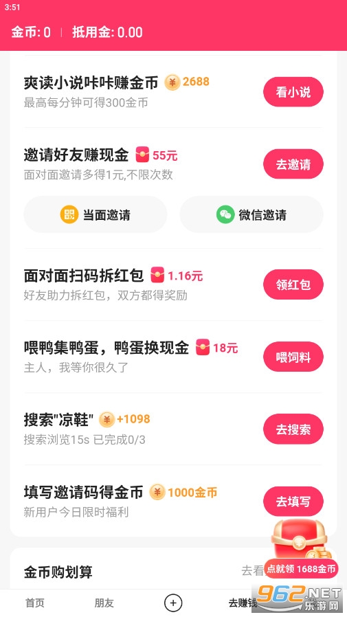 日常任务有新人填写邀请码领取红包和签到得金币。如果你是通过好友的分享链接下载的软件,可以填写好友的邀请码,能奖励一元,好友也能获得相应的奖励。