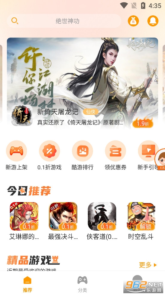 《扣扣游手游折扣平台》是一款为朋友们打造的手游折扣平台,游戏中玩家可以选择传奇、角色扮演、策略、卡牌等各种不同类型的游戏去进行体验,可以选择0.1折福利游戏,平台每天还有着大量的精品游戏推荐,让你可以快速找到自己喜欢的游戏。
