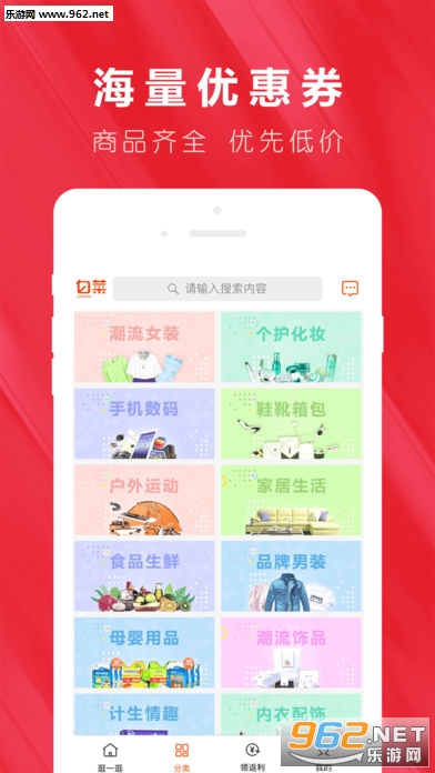 数百种品类的优惠券,天天特价、8.8专场、9.9包邮、1元包邮、每日精选、限时抢购、新人专享等多个购物版块推荐最好的购物清单,让顾客轻松一站式购物。要购物,先领券,每单都有返利,分享还能赚钱,不想省钱都难,让你以更低的价格,买到你中意的品牌。